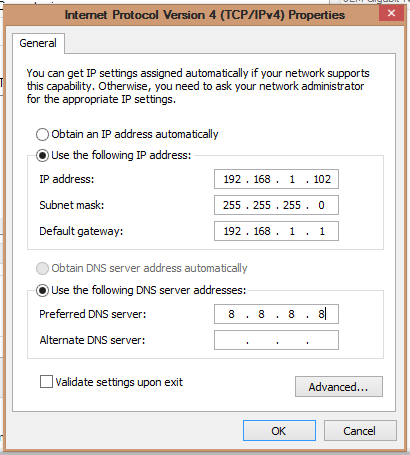 وهذه الإعدادات تتضمن الذهاب اولا إلى لوحة التحكم control panel تم شبكات network and sharing center بعد ذلك إعدادات كروت الشبكة change adapter settings . إختر كارت الشبكة التي تستعملها في الإتصال مابين ويفي او كايبل ، انقر بزر الفأرة الايمن ، إذهب إلى خصائص proprieties تم إعدادات الايبي 4 . وقم بكتابة في الخانة الاولى الرقم الاتي : 192.168.1.102 في الــ Mask 255.255.255.0 وفي الــ Gateway اكتب 192.168.1.1 وفي الــ DNS اكتب 8.8.8.8 تم قم بالتحفيظ وهكذا ستستطيع الولوج إلى الانترنت .